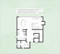 A play on perception where the characters appear within the floor plan of their house, their identities suggested through the shifting geometry of the space they inhabit.